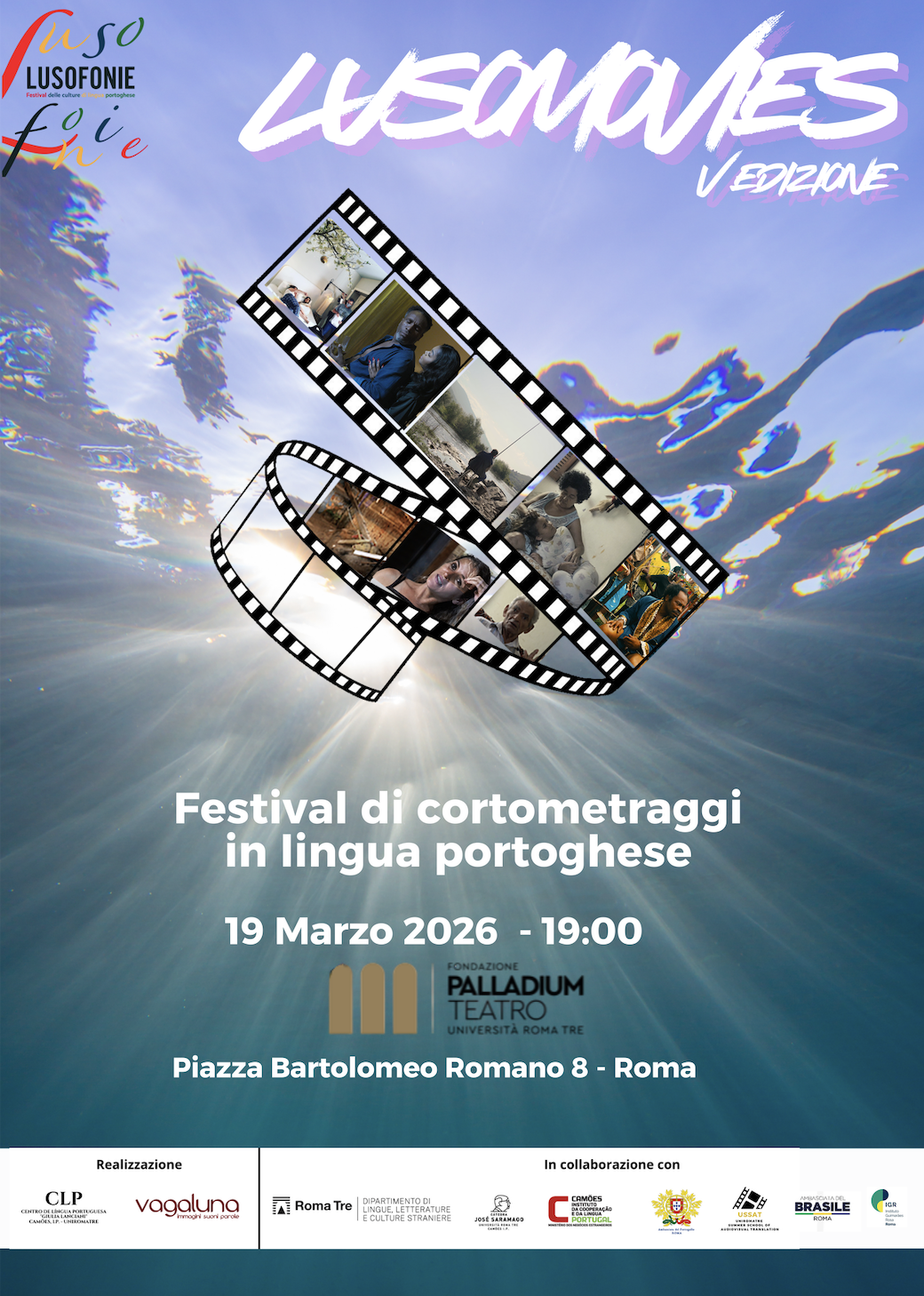 Giovedì 19 marzo 2026 alle ore 19, si presso il Teatro Palladium (Piazza Bartolomeo Romano, 8), Lusomovies. Festival di corto-metraggi in lingua portoghese, un evento organizzato in collaborazione con l’Associazione Vagaluna, il Centro di Lingua Portoghese “Giulia Lanciani”, con Uniromatre Summer School of Audiovisual Translation (USSAT) e con il Laboratorio di Ricerca per la traduzione audiovisiva e per la scena (LABTRAD) del Dipartimento di Lingue, Letterature e Culture Straniere.