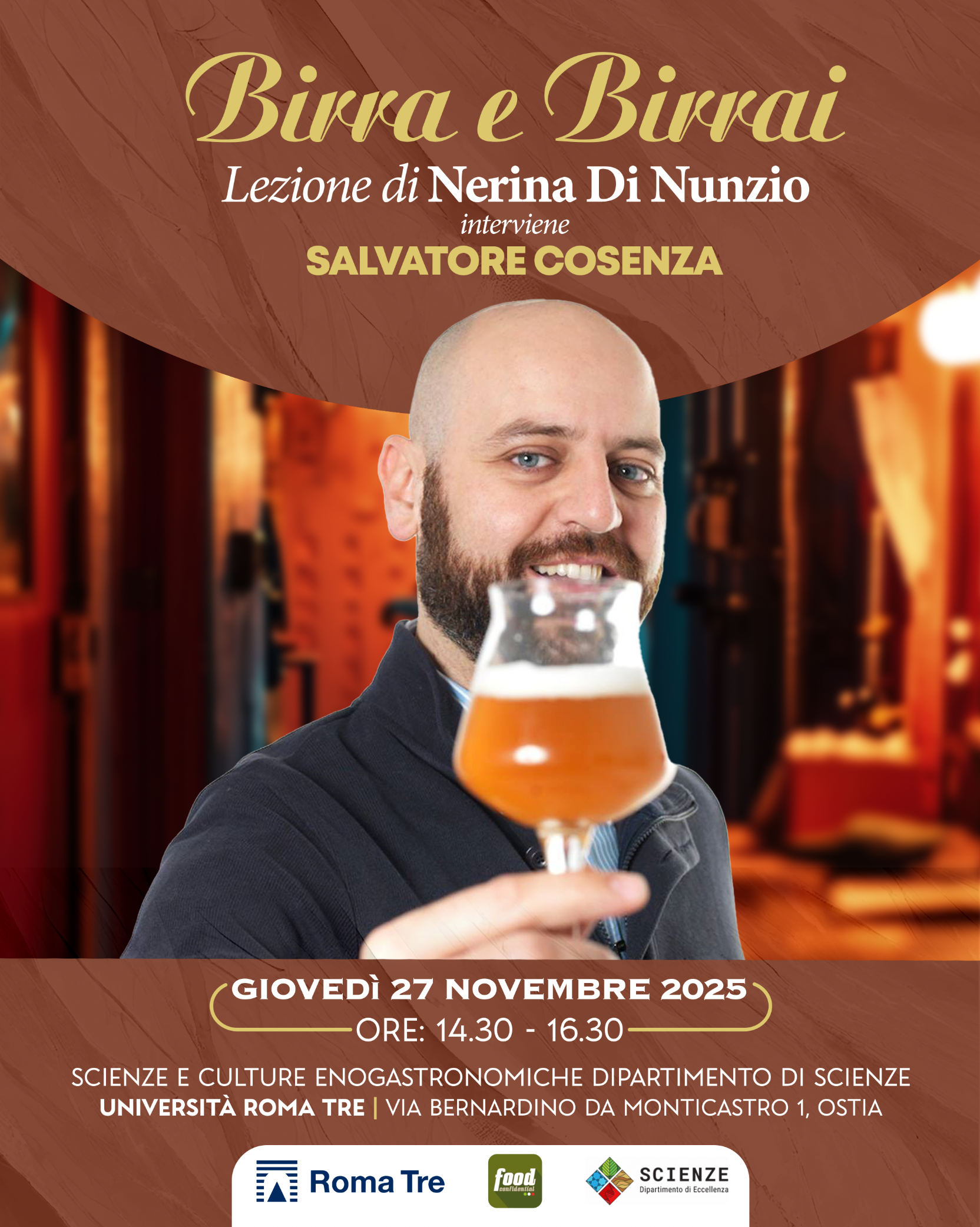 Giovedì 27 novembre 2025, nell’ambito degli incontri di Professione enogastronomo I, si terrà il seminario dal titolo "Birra e birrai", alle ore 14:30, in aula 1, presso il Polo universitario di Roma Tre a Ostia.
