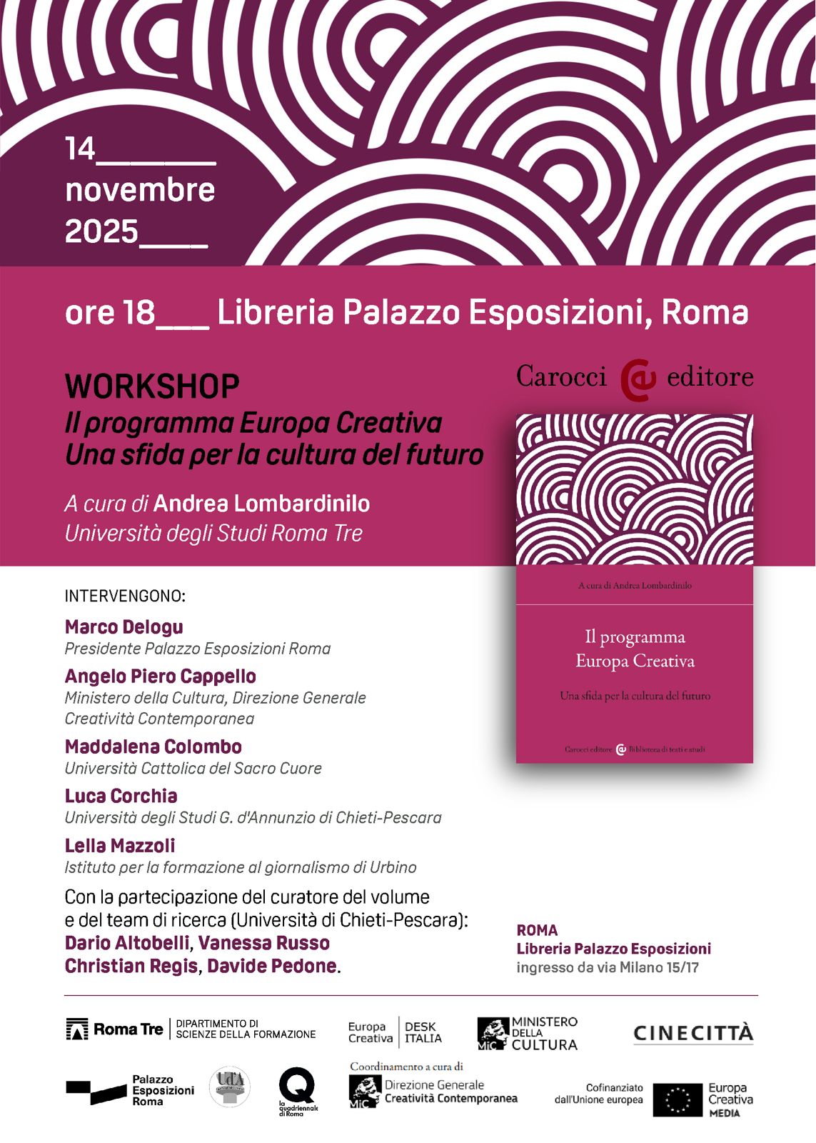 Il Dipartimento di Scienze della Formazione invita al workshop Il programma Europa Creativa. Una sfida per la cultura del futuro che si terrà venerdì 14 novenbre 2025 alle ore 18.00 presso la Libreria Palazzo Esposizioni in via Milano 15 e 17 a Roma.