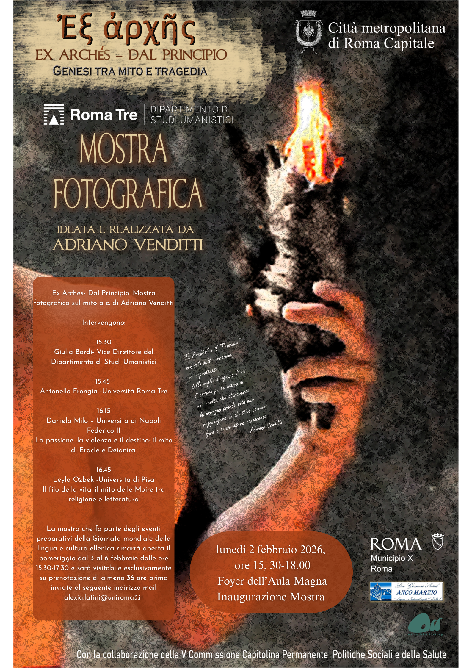 Adriano Venditti, studente dell’Università Roma Tre, presenterà una mostra fotografica dedicata alla mitologia greca, ospitata nel foyer dell’Aula Magna del Dipartimento di Studi Umanistici. Attraverso le sue immagini, l’autore propone un percorso visivo che rilegge i miti dell’antichità classica, mettendone in luce il valore simbolico e culturale.