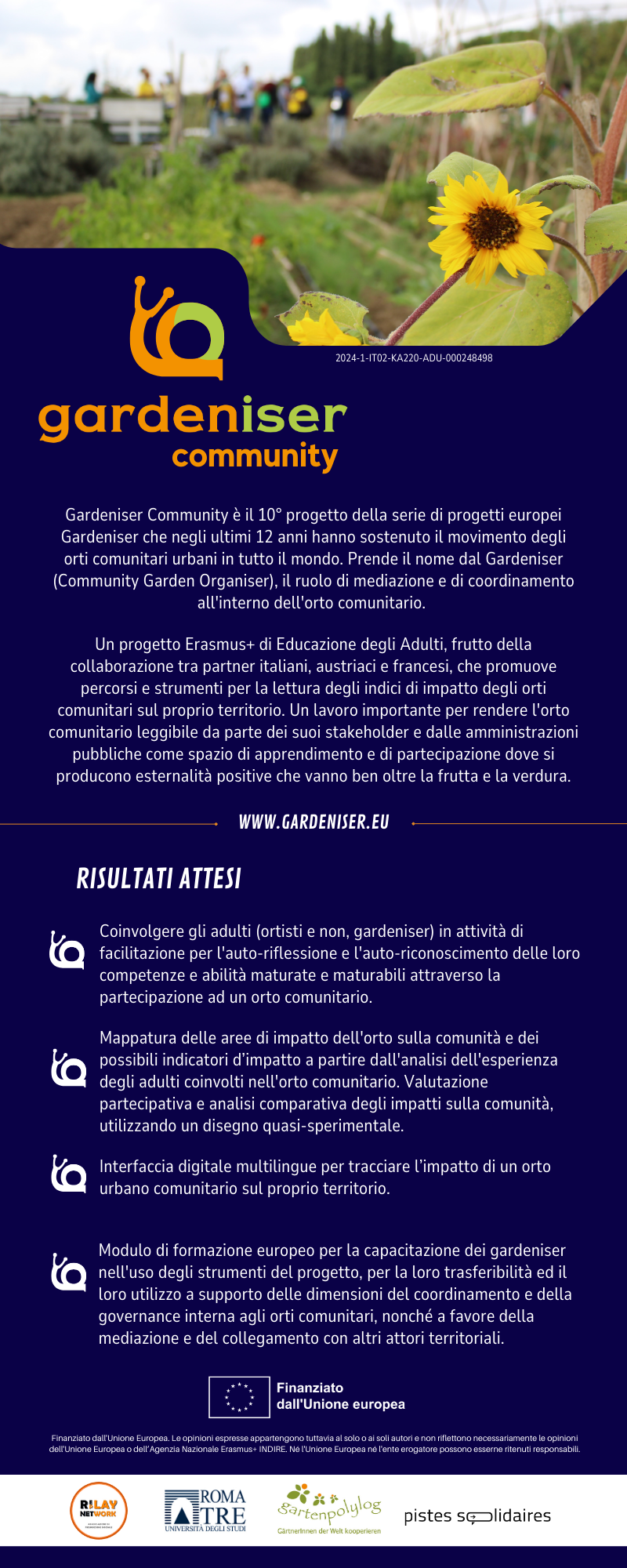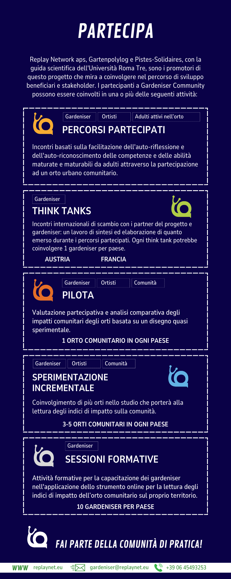 Per maggiori informazioni su Gardeniser Community, si può consultare la pagina dedicata sul sito di Economia: Link identifier #identifier__189728-2Gardeniser community - Dipartimento di Economia, o contattare i referenti: prof. Pasquale De Muro (pasquale.demuro@uniroma3.it), dott.ssa Laura Silici (laura.silici@uniroma3.it).