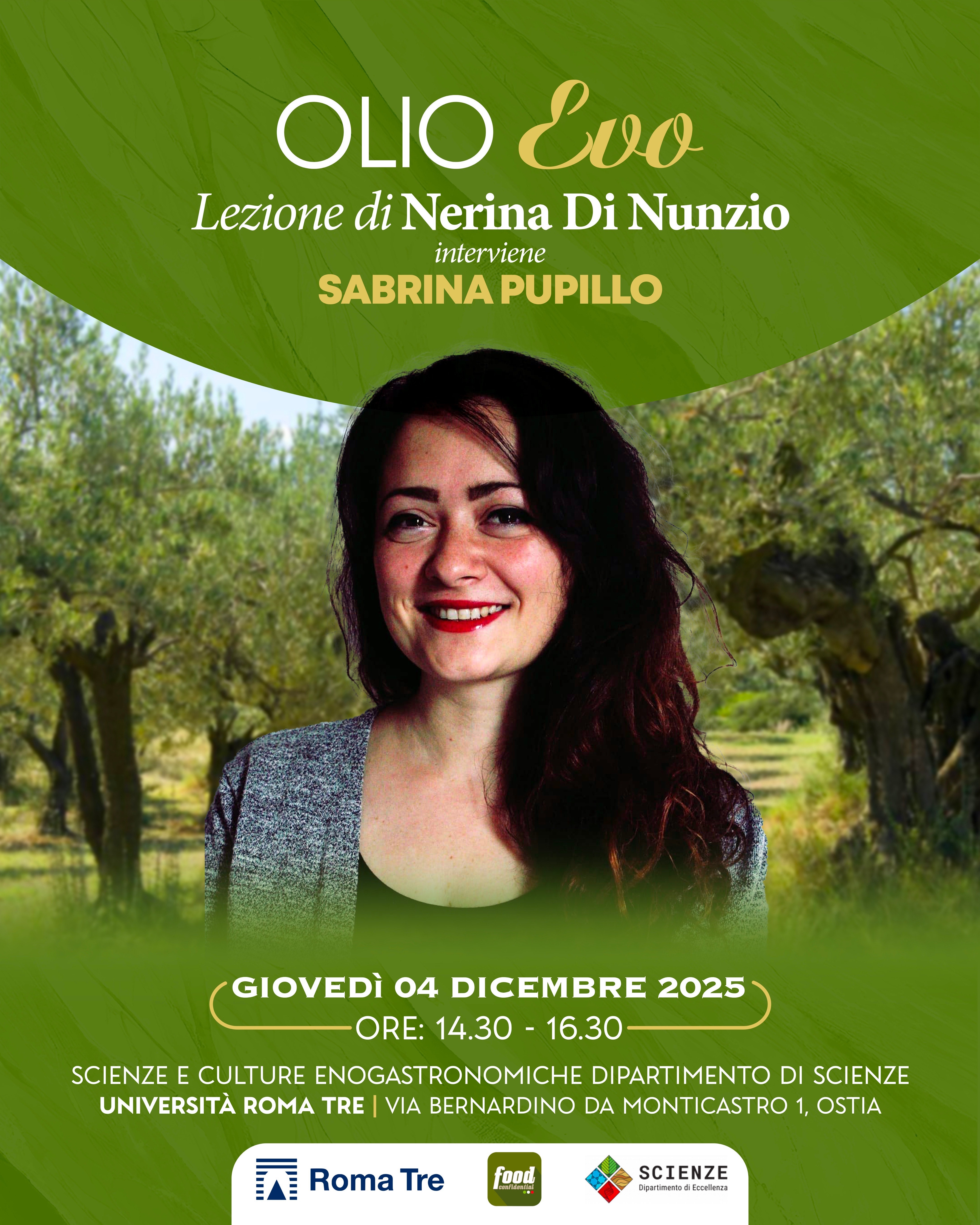 Giovedì 4 dicembre 2025, nell’ambito degli incontri di Professione enogastronomo I, si terrà il seminario dal titolo "Olio EVO", alle ore 14:30, in aula 1, presso il polo universitario di Roma Tre a Ostia.