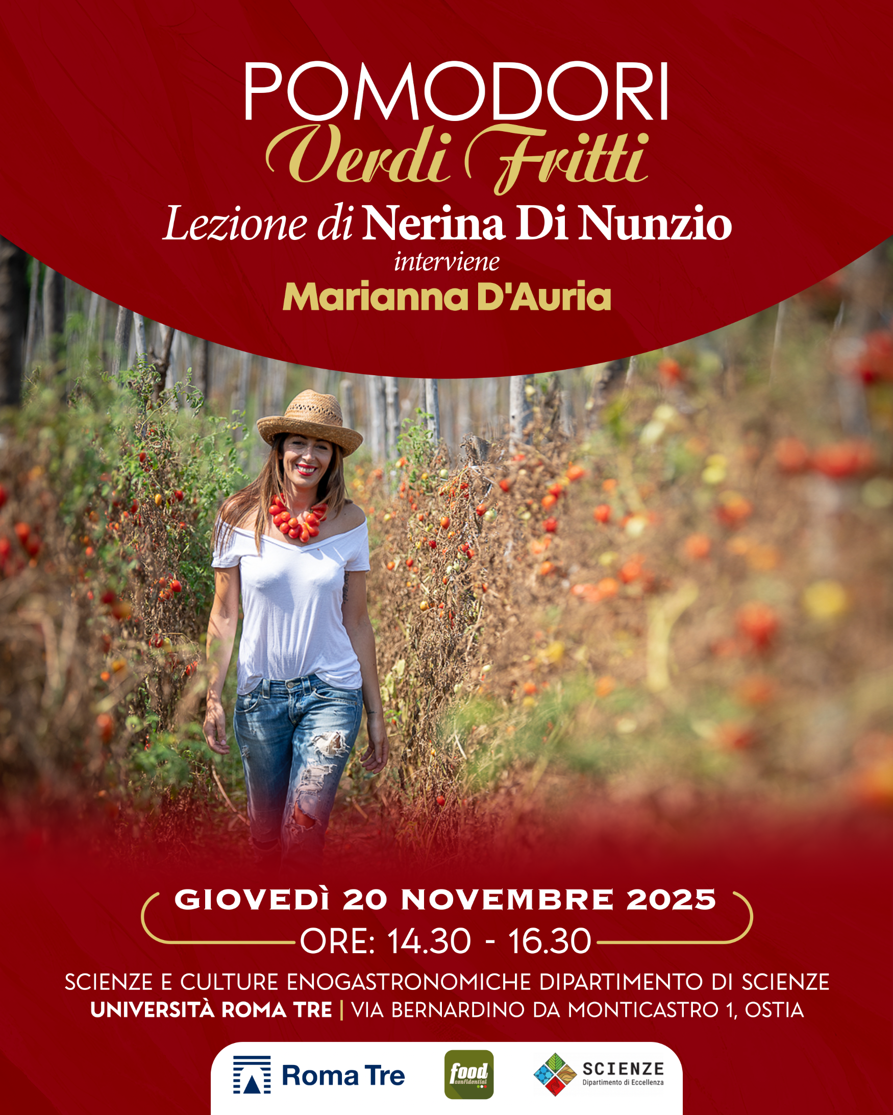 Giovedì 20 novembre 2025, alle ore 14:30, presso il Polo universitario di Roma Tre a Ostia (Aula 1), nell’ambito degli incontri di Professione enogastronomo I, si terrà il seminario dal titolo "Pomodori verdi fritti".