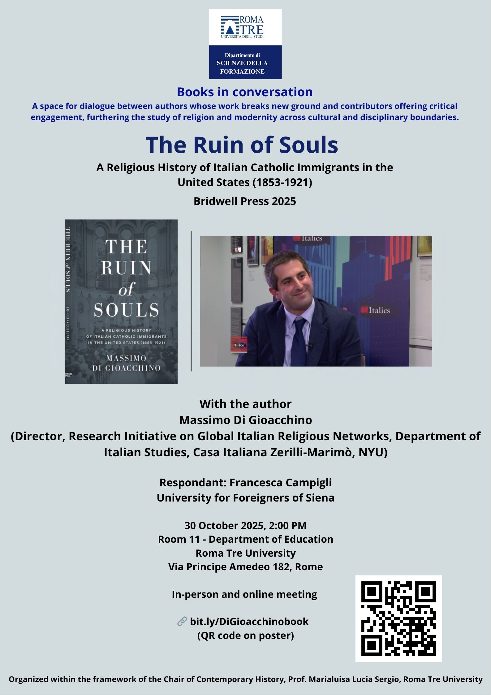 Se ne parlerà con l'autore Massimo Di Gioacchino (Director GLIRN, Research Initiative on Global Italian Religious Networks, Department of Italian Studies, Casa Italiana Zerilli-Marimò, NYU) e con la storica Francesca Campigli (Università per stranieri di Siena).