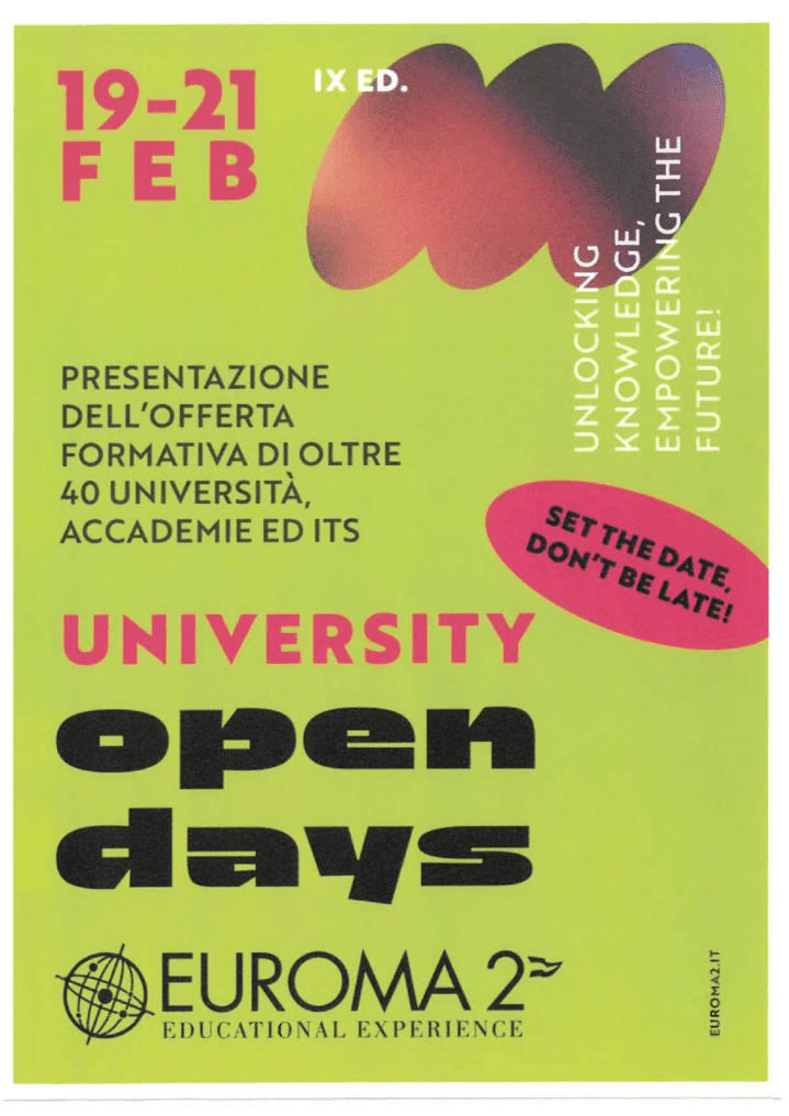 Anche quest’anno l’Università degli Studi Roma Tre parteciperà all’evento “University Open Day”, che si terrà dal 19 al 21 febbraio 2025 presso il centro commerciale Euroma2.